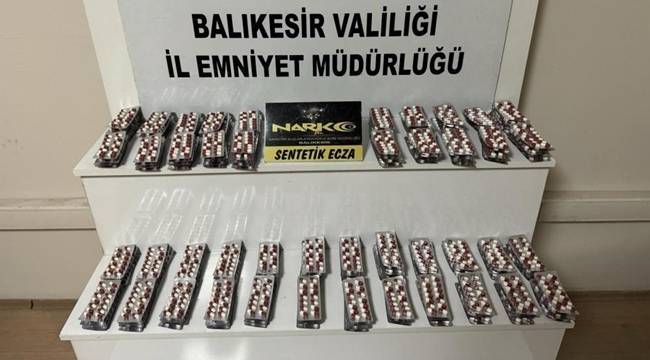 Balıkesir İl Emniyet Müdürlüğü Narkotik Suçlarla Mücadele Şube Müdürlüğü ekipleri, il genelinde uyuşturucu madde ticareti yapan şahıslara yönelik sürdürdükleri çalışmalarda Karesi ilçesinde şüphe üzerine durdurdukları aracın kaput altında motor kısmına gizlenmiş 2 bin 767 adet sentetik ecza hapı ele geçirdi. Olayla ilgili gözaltına alınan D.A. (24) ve E.K. (28) hakkında "uyuşturucu veya uyarıcı madde imal ve ticareti" suçundan işlem başlatıldı.