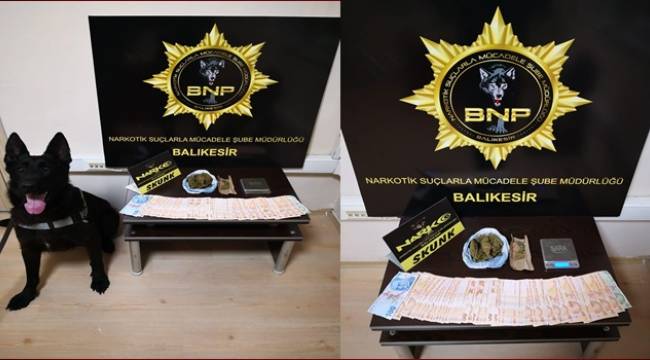 Balıkesir İl Emniyet Müdürlüğü Narkotik Suçlarla Mücadele Şube Müdürlüğü görevlilerince yapılan analiz çalışmasında Manyas ilçesinden uyuşturucu madde getireceği değerlendirilen araç, Karesi ilçesinde durduruldu. Araçta yapılan aramalarda 64.14 gram skunk maddesi,1 adet hassas terazi ile uyuşturucu madde ticaretinden elde edildiği değerlendirilen 6.670 TL. ele geçirildi. Operasyona narkotik dedektör köpeği Bath da katıldı.