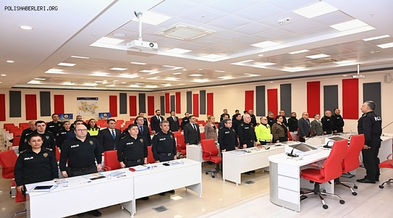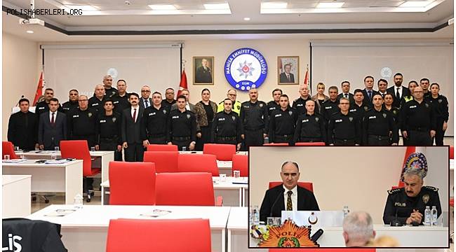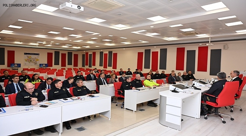 Kanuni Sultan Süleyman Toplantı Salonu’nda düzenlenen toplantıya; İl Emniyet Müdürü Fahri Aktaş, İl Emniyet Müdür Yardımcıları, İlçe Emniyet Müdür ve Amirleri ile Şube Müdürleri katıldı.