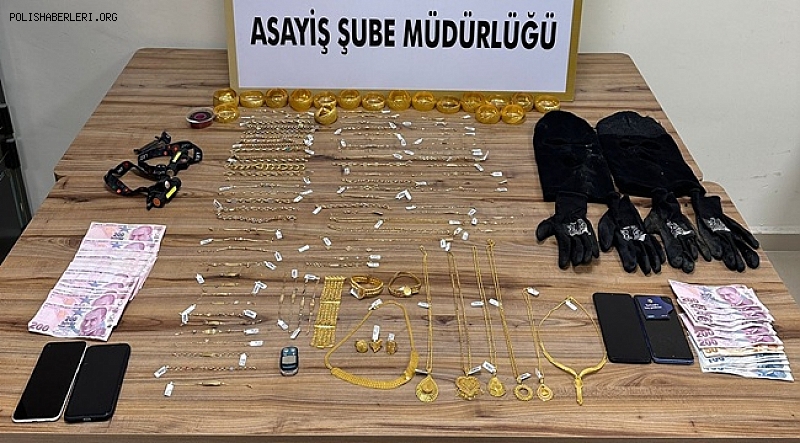 77 adet altın bileklik, 10 adet altın kolye, 3 adet altın yüzük, 3 adet altın kelepçe, 18 adet imitasyon bilezik, 1 adet metal zincir, ikiye bölünmüş halde 1 adet madalyon kolye, 1 adet kepenk kumandası, 2 adet maske, 2 adet fener, 4 çift eldiven, 4 adet cep telefonu ve 12 bin 705 TL para ele geçirildi. Ele geçirilen altınların iş yeri sahibine teslim edildiği belirtildi.