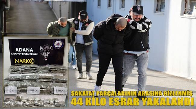 Narkotik polisler söz konusu aracı takip edip durdurdu. Polis araçta yaptığı aramada sakatat parçalarının içerisine zulalanmış bir valiz buldu. Valizin içinde ise 44 kilogram esrar ele geçirildi. Olayla ilgili Orhan A. (30), Furkan A. (23), Haydar Talip C. (24), Deniz K.(33) gözaltına alındı.